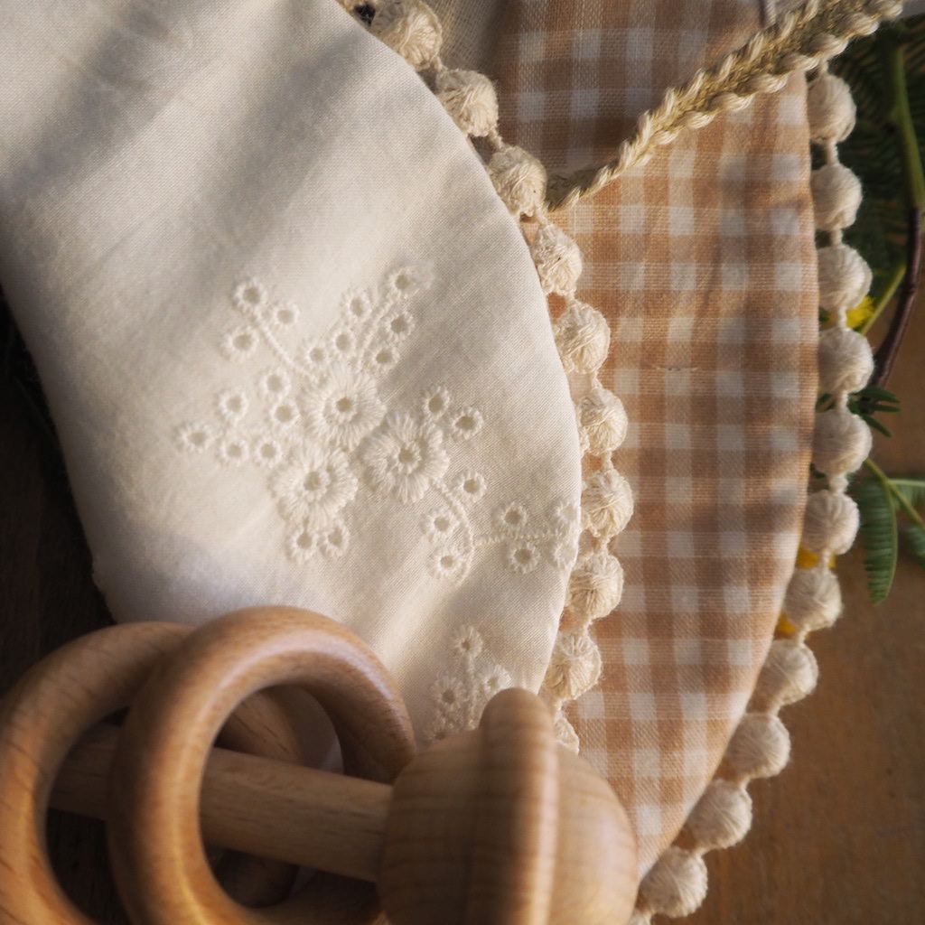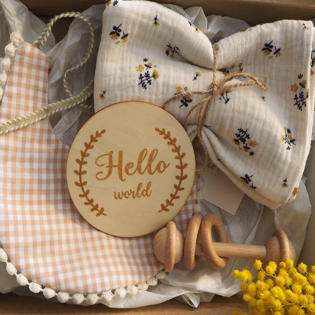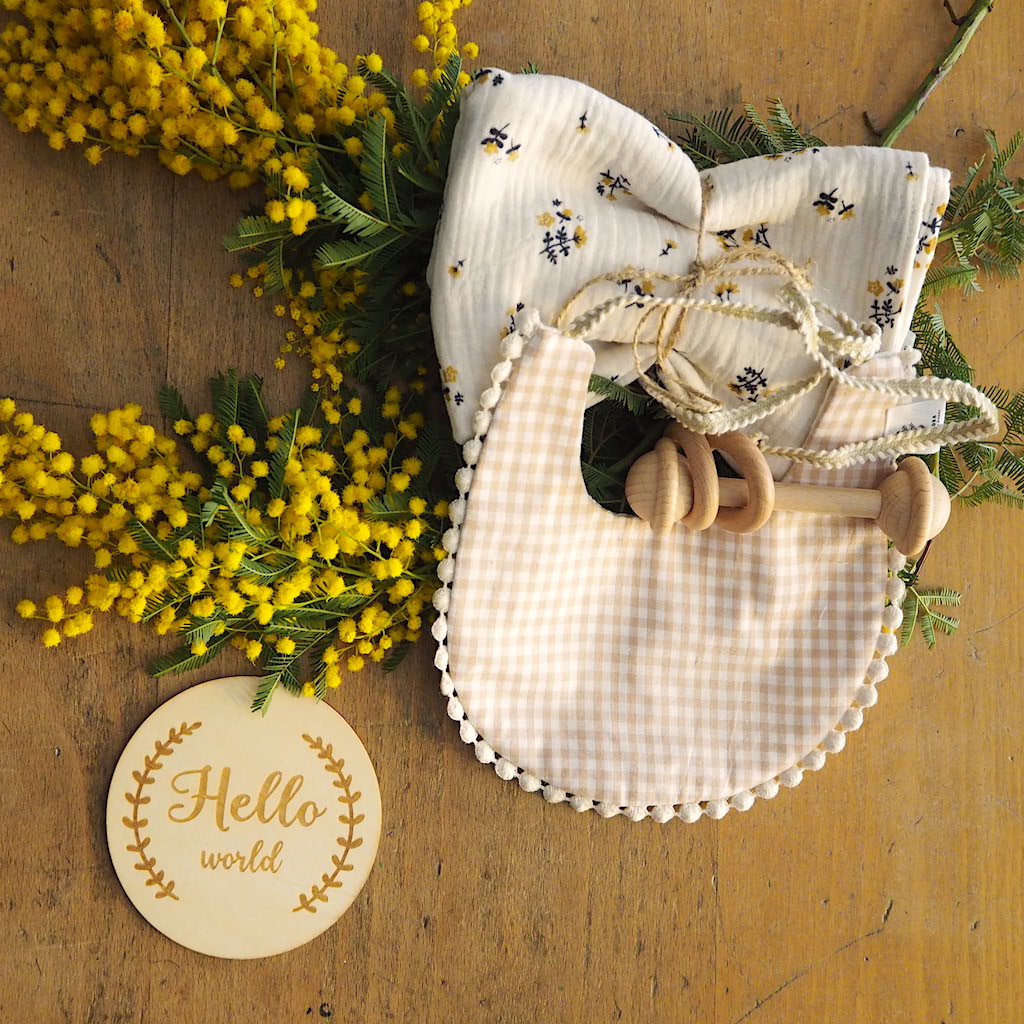 • Incluye babero reversible, sonajero, muselina y chapa bienvenida.